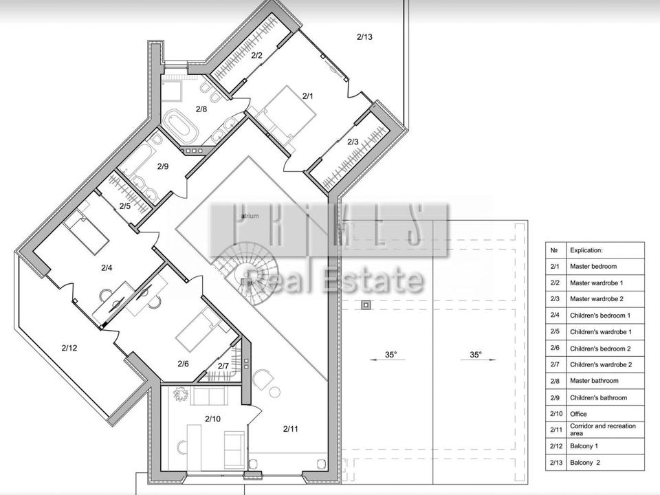 -Будинок має простору кухню-вітальню з атріумом на 2 поверхи, допоміжну комору з кухні, 4 спальні зі своїми гардеробними та панорамними окнами, кабінет, 4 санвузли, додатковий гардероб при вході.