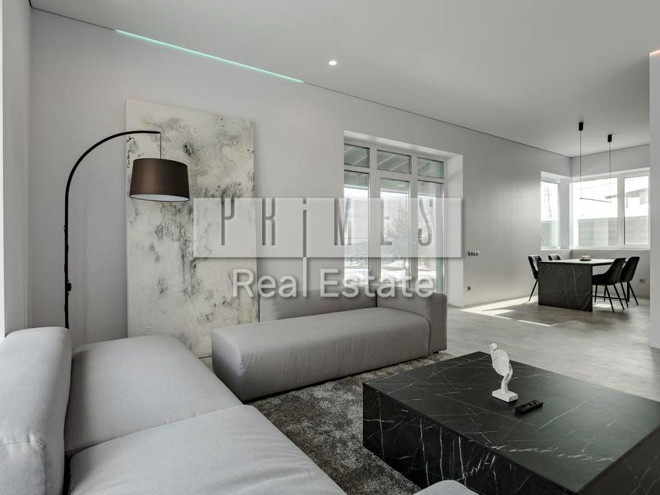 3 спальні, 1 кабінет (можна переробити під спальню), 2 гардеробні, пральні з пралкою та сушильними машинами, гостина з великою кухнею (холодильник, посудомийна машина, духовий шафа, варочна поверхня). Уся техніка Bosch.
