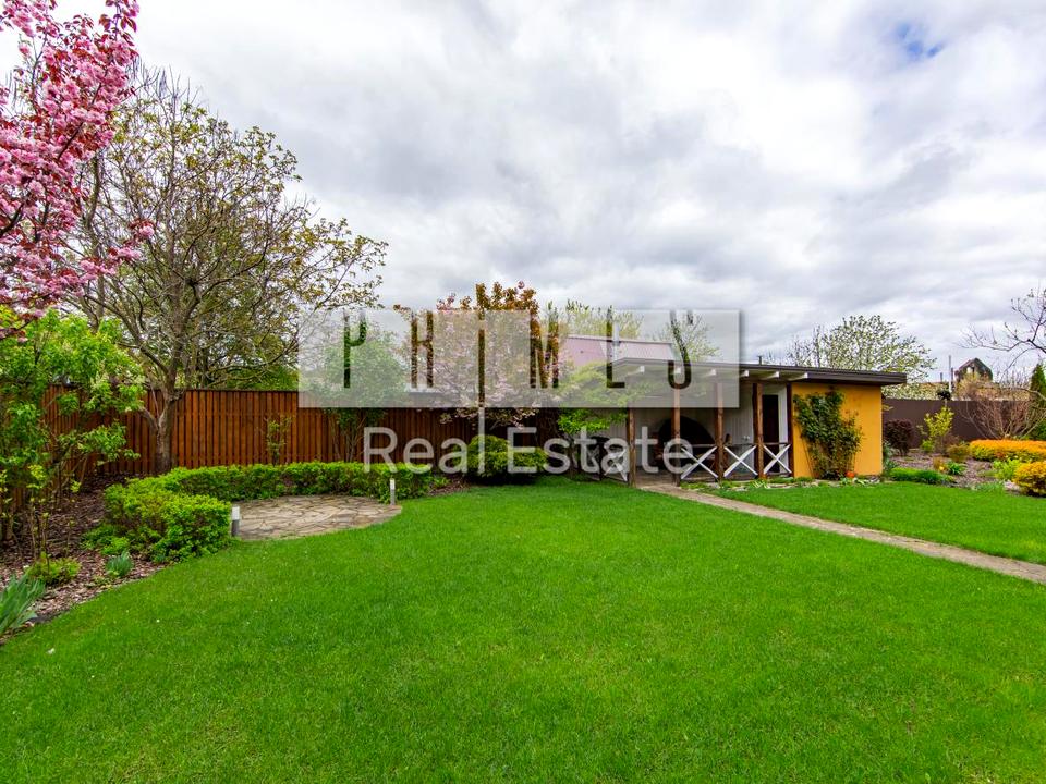 На території є велика літня веранда з можливістю заскління, газон з авто поливом, фруктові дерева, виноград, квіти, ставок з фонтаном, майданчик для відкритого басейну накриття для автомобілів.
