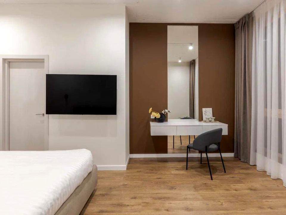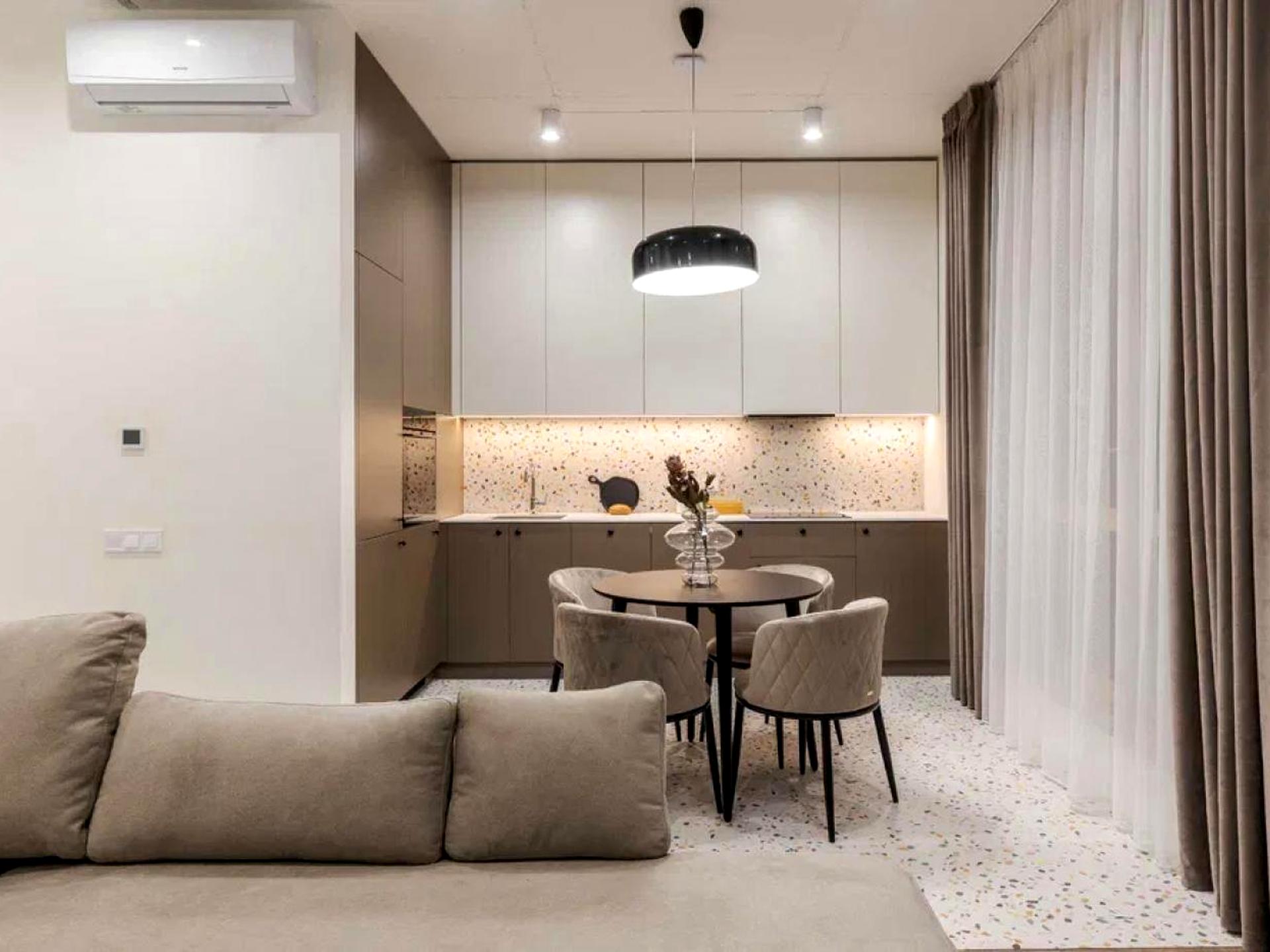 Житло виконане за авторським проєктом із якісним дизайнерським ремонтом. Продумане планування включає спальню, кухню-вітальню, гардероб, роздільний санвузол і терасу. Квартира повністю мебльована та оснащена сучасною побутовою технікою: холодильником, посудомийною машиною, духовою шафою, пральною машиною, кондиціонером, пилососом і телевізором.