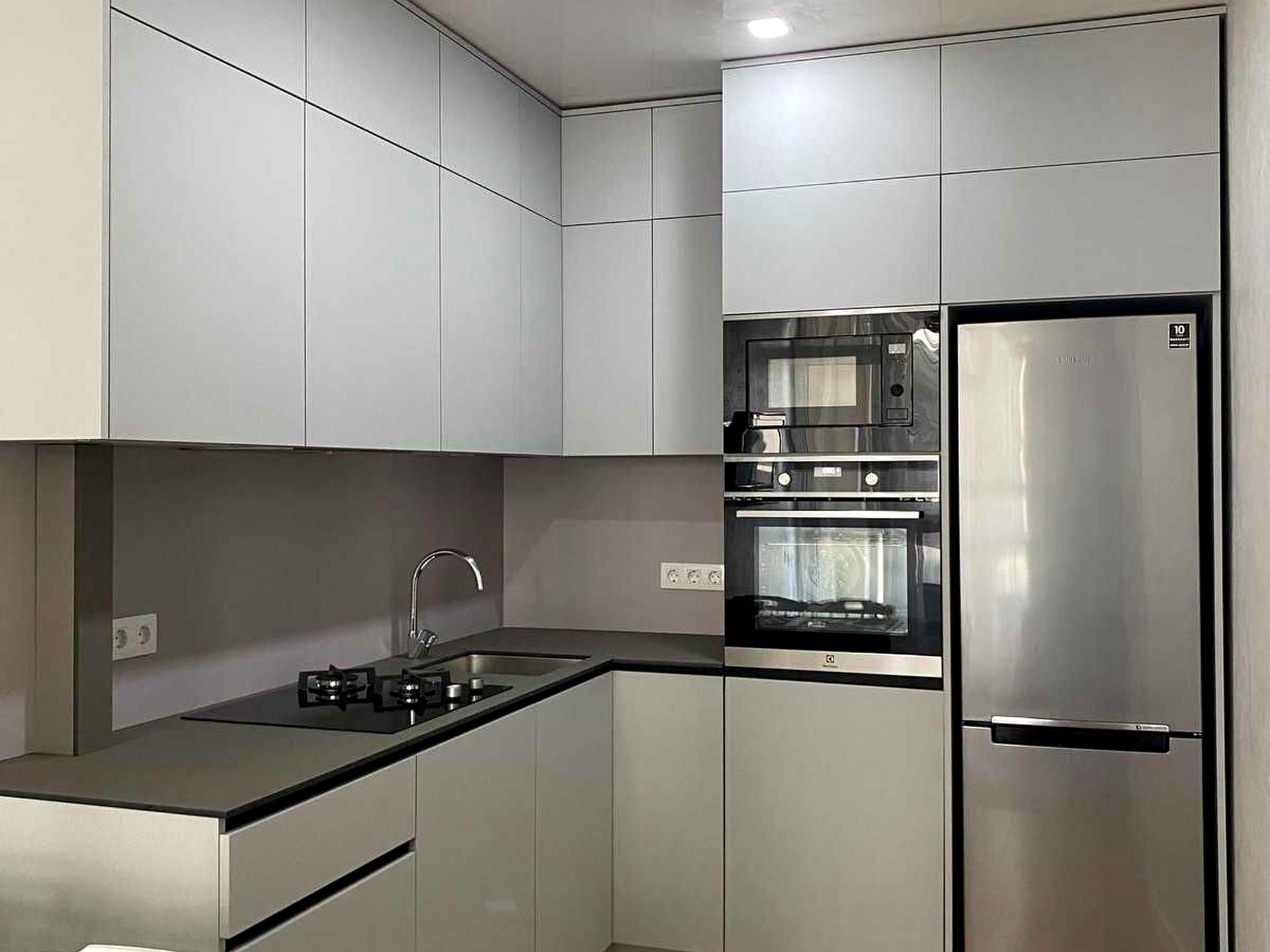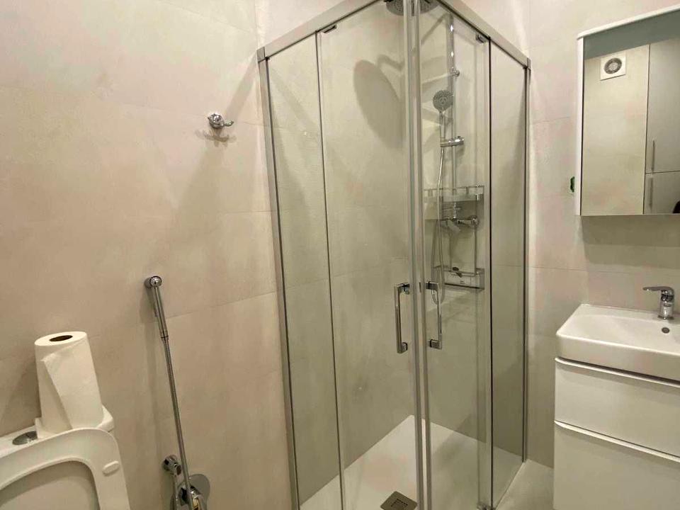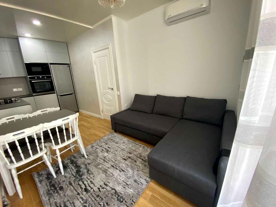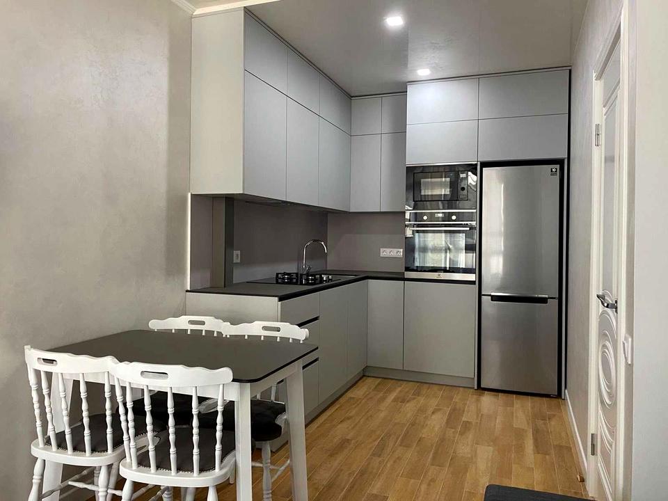 Простора та затишна квартира в сучасному житловому комплексі. Велика кухня-студія з розкладним диваном, обіднім столом, вмонтованою технікою: мікрохвильова піч, електродуховка, газова варильна поверхня, посудомийна машина.