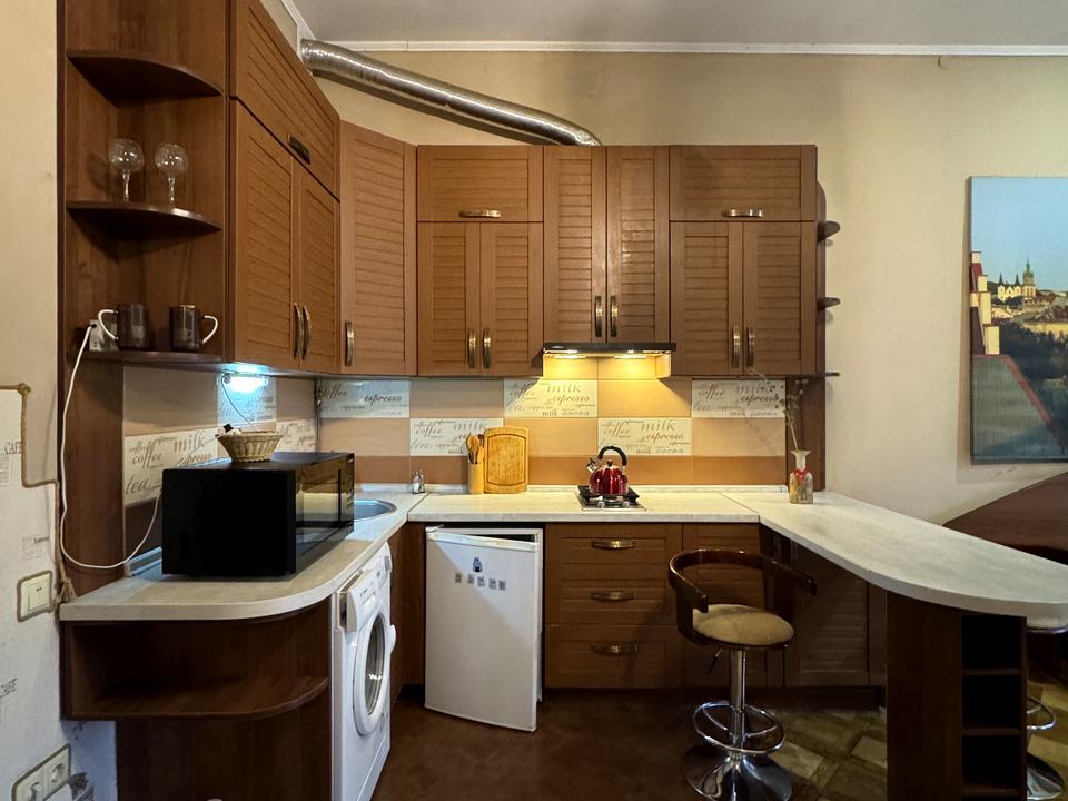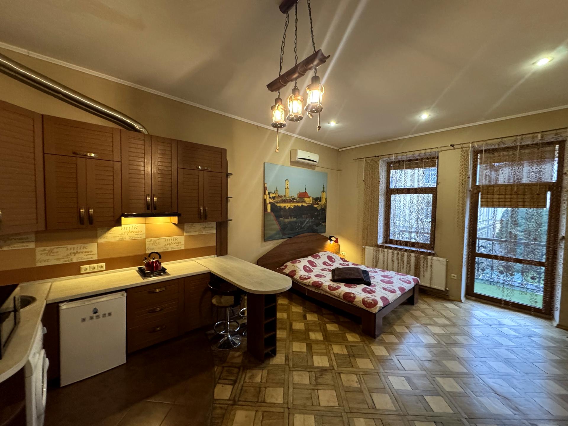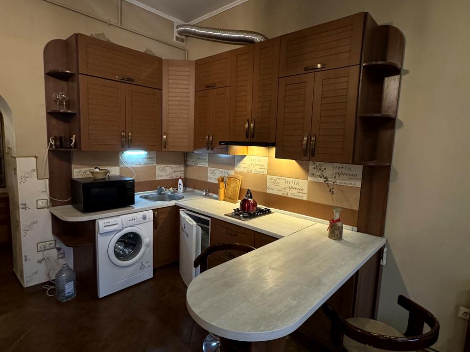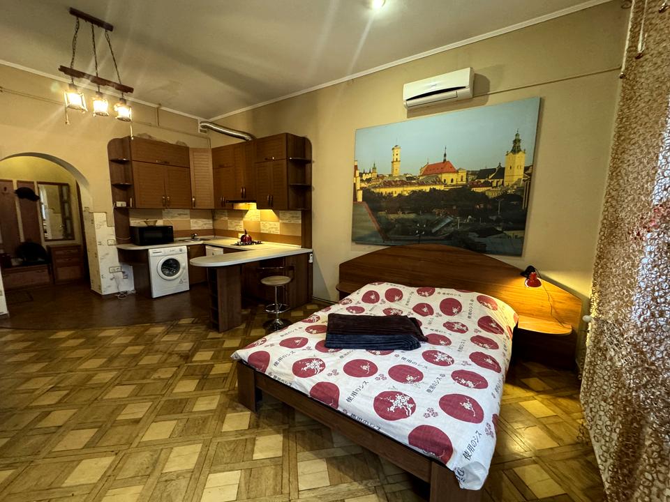 В квартире 1 комната, Технологія будівництва - Цегляна. Планировка комнат Студия. В квартире есть Телевизор, Спутниковое ТВ, Шкаф, Кровать, Кондиционер, Стиральная машина, Душевая кабина, Холодильник, Микроволновка, Посуда. Дом построен в 1903 году. Общее состояние квартиры - С ремонтом. Работает без света - вода, газ, интернет. Комиссия за услуги 100 %