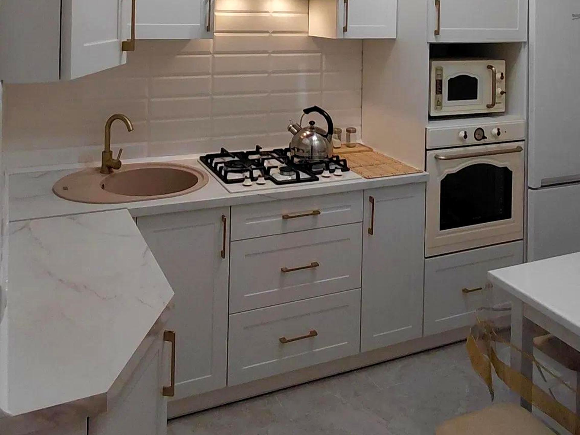 Кухня площею 8 м² укомплектована всією необхідною побутовою технікою: варильна панель, духова шафа, мікрохвильова піч, холодильник, пральна та сушильна машини, пилосос. Є весь необхідний посуд.