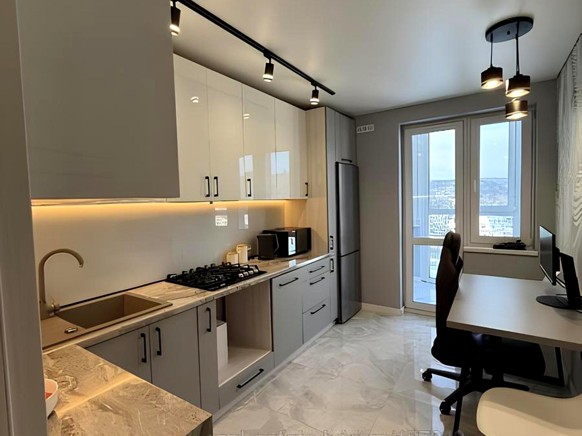 Кухня обладнана всією необхідною побутовою технікою преміум-класу Samsung та Bosch: мікрохвильова піч, мультиварка, електрочайник, робот-пилосос.