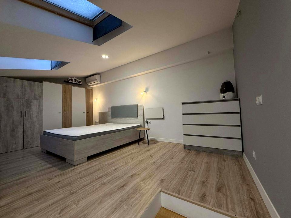 Дворівнева квартира з окремою спальнею на другому рівні, просторою кухнею-вітальнею та додатковою ізольованою кімнатою. Суміжний санвузол. Є французький балкон з гарним видом у внутрішній двір.