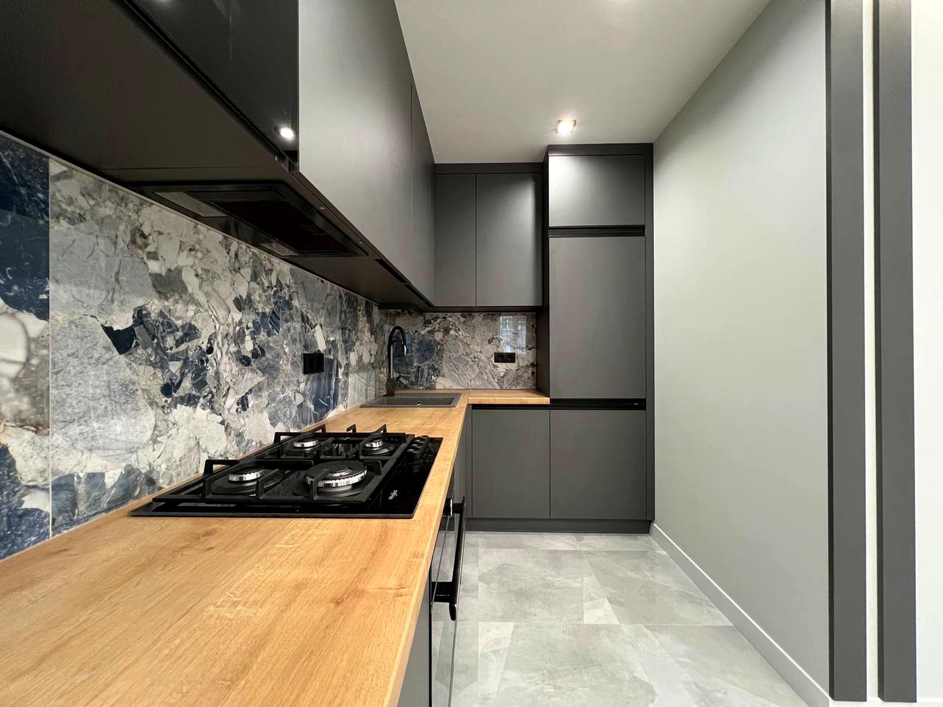 Квартира повністю укомплектована вмонтованими меблями та технікою: пральна машина + сушка, посудомийна машина, мікрохвильова піч, духова шафа, холодильник, газова варильна поверхня.