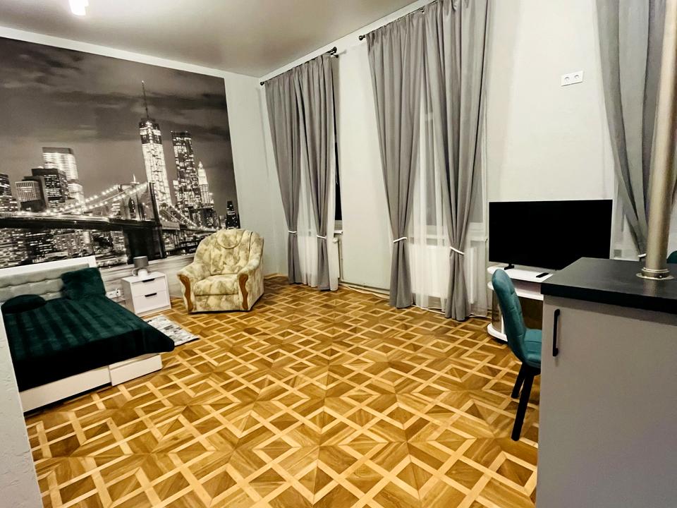 Перша здача, велика кімната + кухня, все нове, 3 великих вікна, висота стель 4 метри, рідний паркет на підлозі, велика шафа-купе, вся необхідна техніка та меблі, центр міста, для однієї-двох дівчат!!!