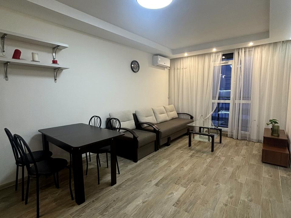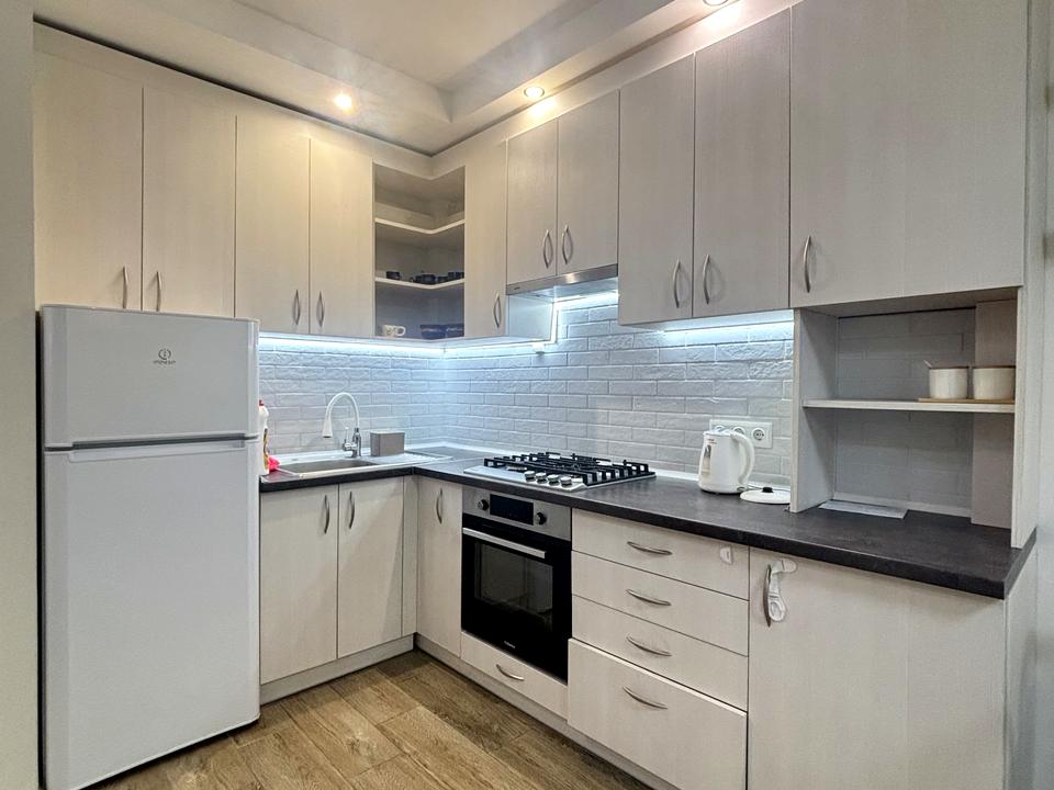 • простора кухня-студія з зоною відпочинку, розкладним диваном та виходом на відкриту лоджію