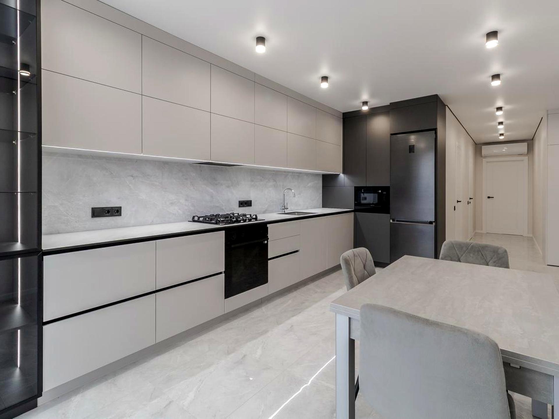Простора кухня-студія з усією необхідною побутовою технікою: холодильник, мікрохвильова піч, духова піч, газова варильна поверхня, посудомийна машина. Також є пральна машина, сушильна машина, два кондиціонера.