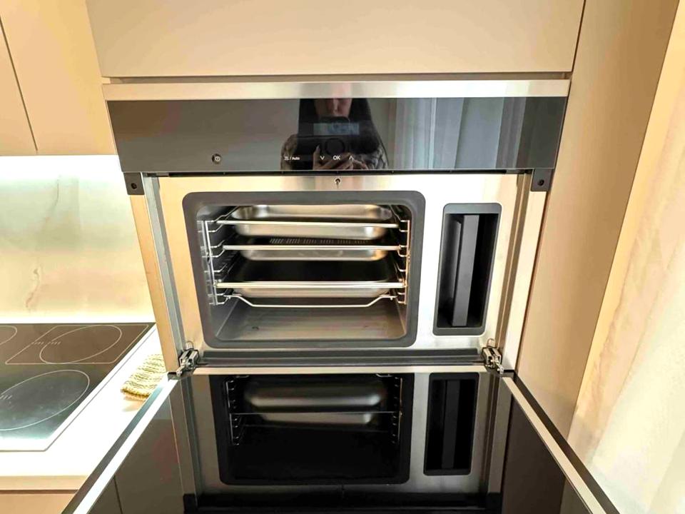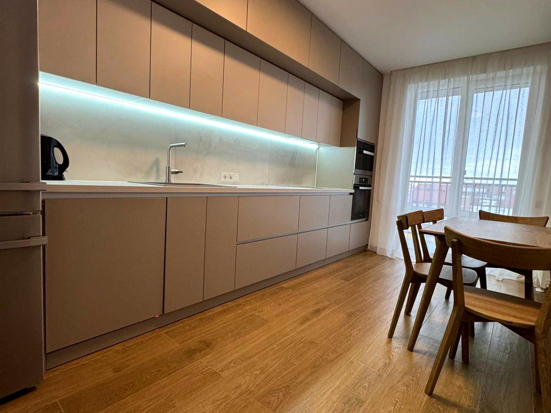 Коридор з вмонтованою шафою-купе. Суміжний санвузол з душовою, кераміка фірми Villeroy and Boch, сантехніка Grohe і Hansgrohe. Пральна машина і сушарка для особливо делікатних речей Miele. Кухня з виходом на балкон. Вікна виходять на особняки (на "Південний"). Облаштована дорогою технікою Miele: холодильник, парова шафа, духовка, індукційна плита; посудомийка Bosch, кондиціонер. Фільтри на воду.
