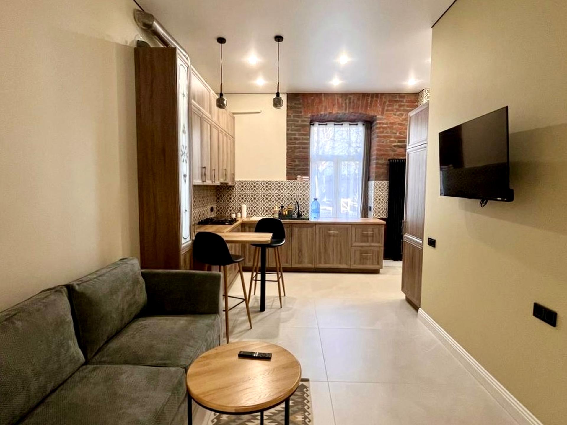 В квартире 1 комната, высота потолков 3 метра, Технологія будівництва - Цегляна, Тип будинку - Спец. проект. Есть газ, кухонная плита газовая. Балкона нет. В квартире есть Телевизор, Подогрев полов, Стиральная машина, Сушильная машина, Душевая кабина, Холодильник, Посудомойная машина. Дом построен в 1906 году. Общее состояние квартиры - С ремонтом. Горячая вода - газовый котел. Количество санузлов: 1. Интернет оптоволоконный. Работает без света - вода, газ, интернет. Тип кухни - кухня-студия. Количество спален: 1. Комиссия за услуги 100 %