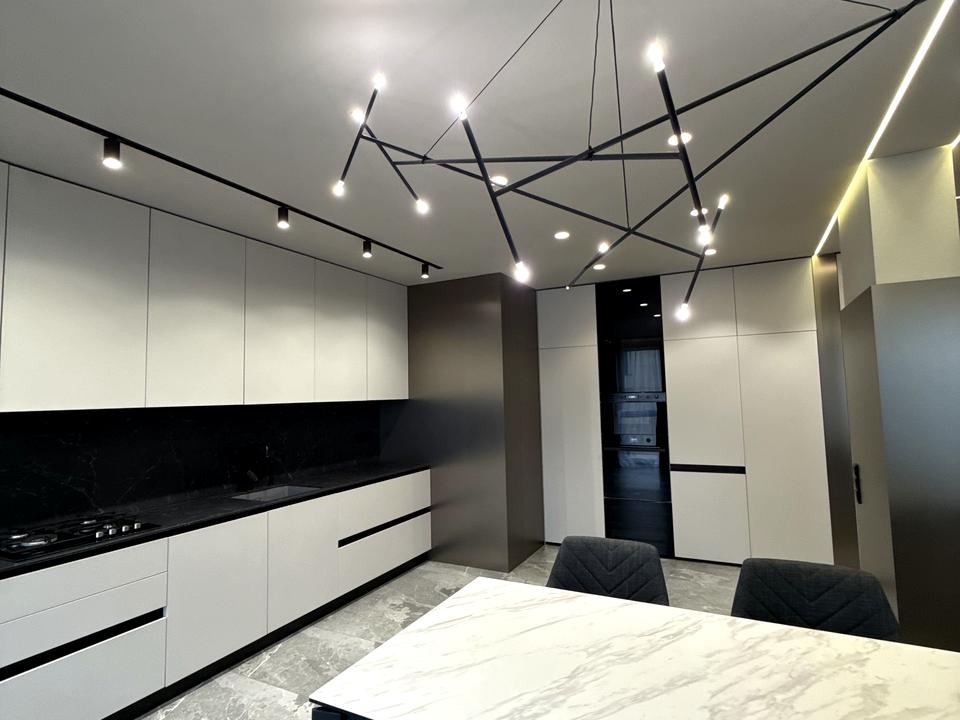 Кухня укомплектована всією необхідною побутовою технікою та меблями: газова плита, духова шафа, посудомийна машина, смарт ТВ, духова шафа, мікрохвильова піч, холодильник, пральна машина, сушильна машина