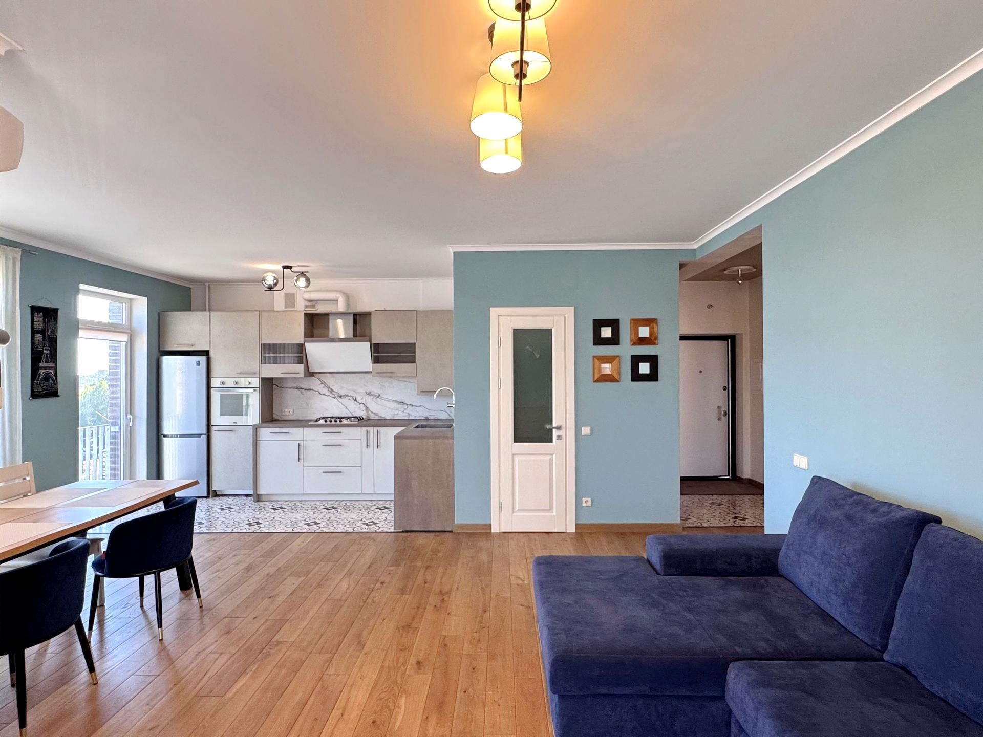 Зручний вхід до квартири, світла окрема кімната з вмонтованою шафою-купе, величезна кухня-вітальня площею 36.6 м2 з трьома панорамними розпашними вікнами-дверима і виходом на балкон, санвузол та приміщення, що може бути гардеробною. Можливе перепланування простору за рахунок відокремлення від кухні-вітальні кімнати площею близько 14 м2.