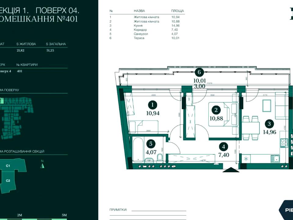 Загальна площа — 51.25 м², житлова — 21.82 м², кухня — 14.96 м².