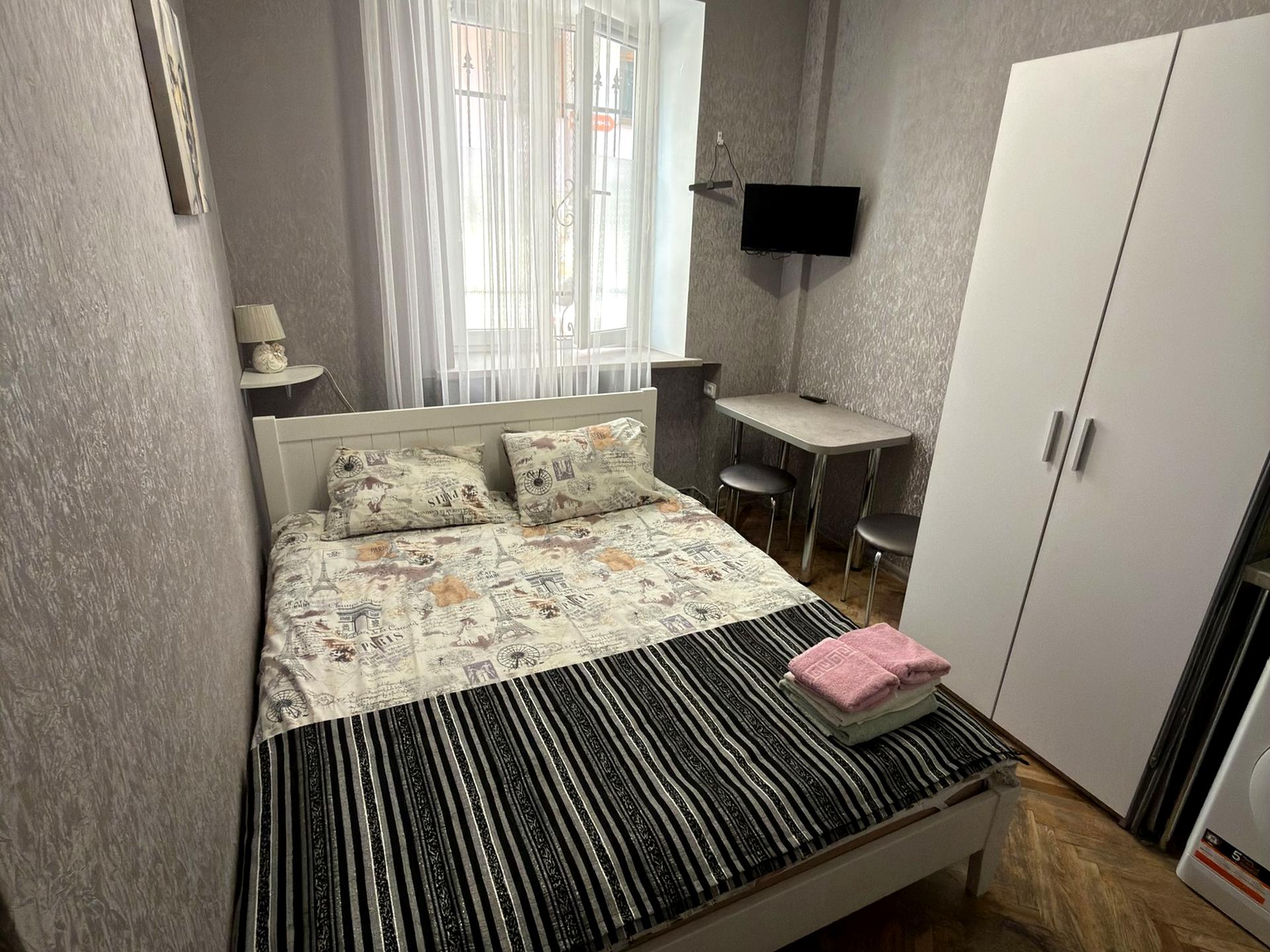 У кімнаті: двоспальне ліжко, ТВ, робоча зона, шафа-купе.