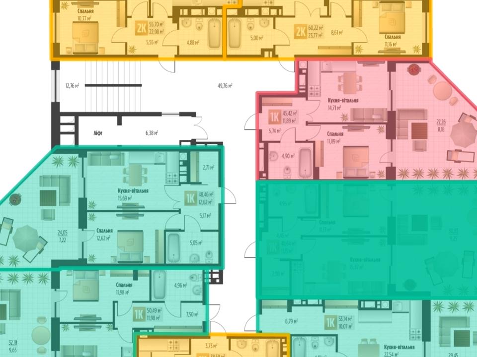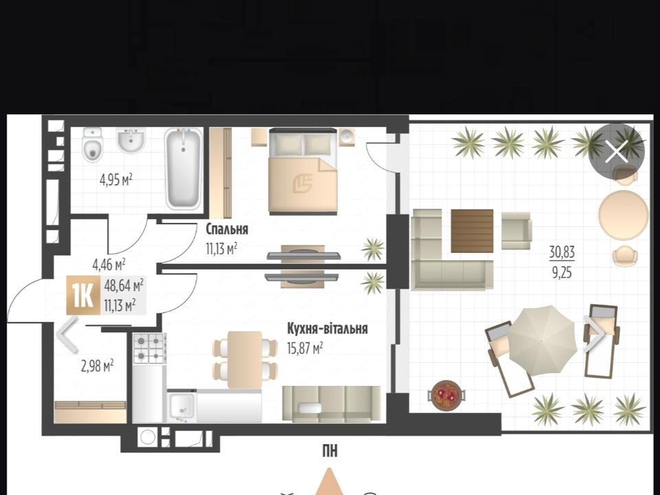 Загальна площа — 48,64 м², квартира розташована на 1 поверсі та має власне велике патіо площею 30 м² — ідеальне місце для відпочинку, тераси, зеленої зони або лаунжу.