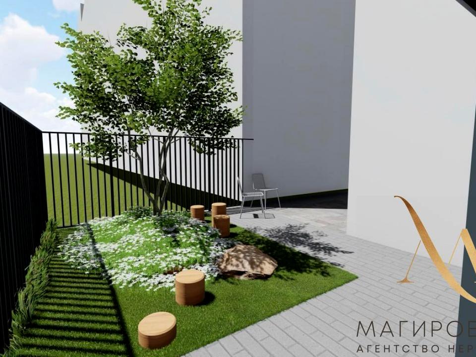 Закрита територія з ландшафтним дизайном і відпочинковою зоною.