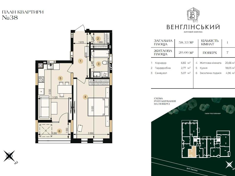 Площа квартири - 58,33 м2.