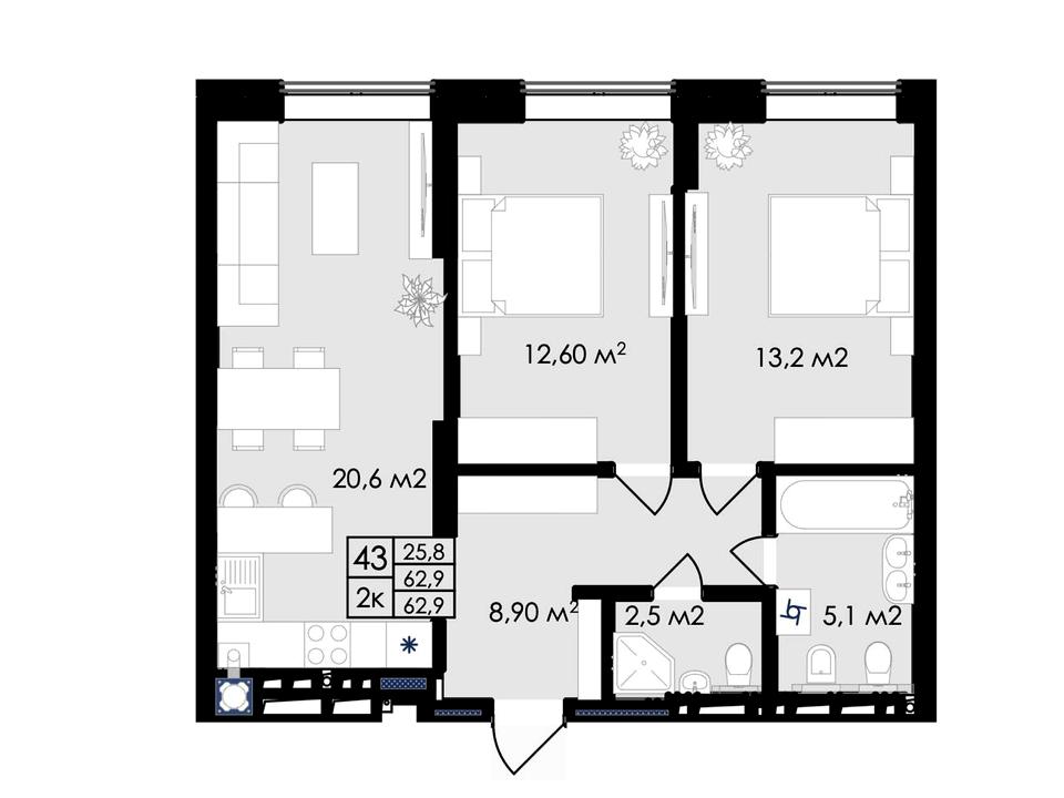 Загальна площа - 62,9 м2, житлова - 25,8 м2, кухня - 20,6 м2.