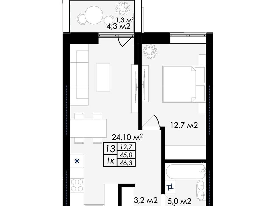 Загальна площа - 46,3 м2, житлова - 12,7 м2, кухня - 24,1 м2.