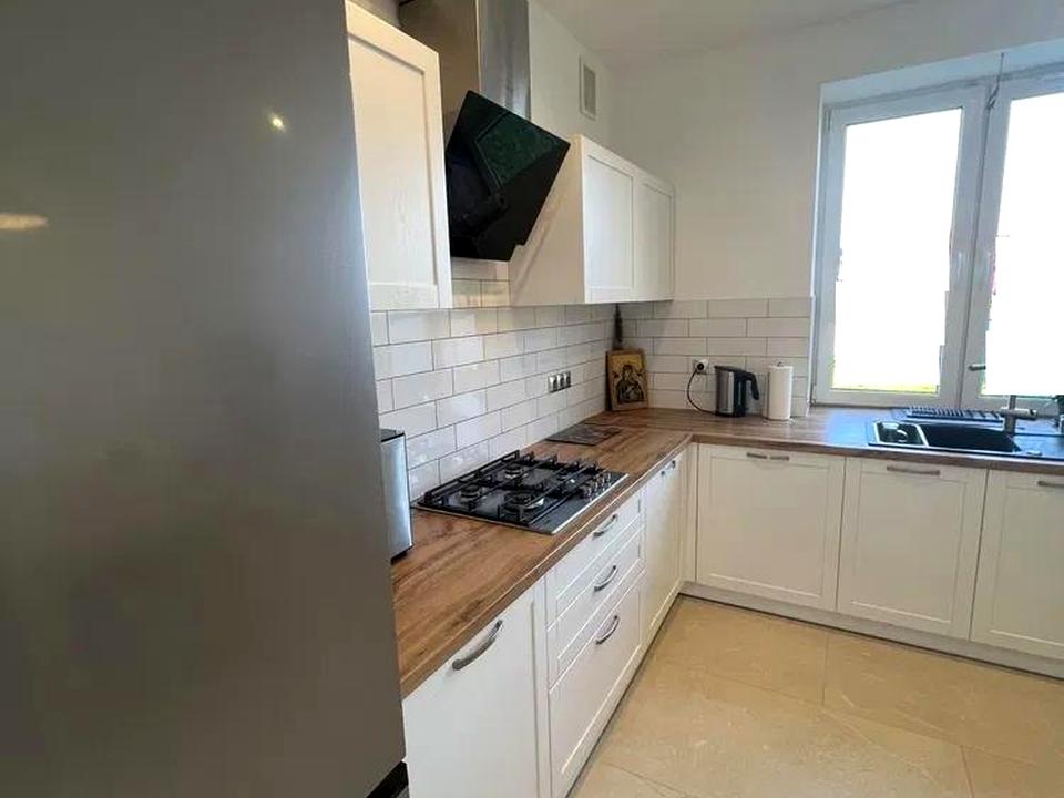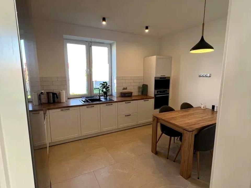 В кухні деревяні сучасні меблі та нова якісна техніка, умивальник та кран фірми Franke, є подрібнювач харчових відходів фірми Franke.