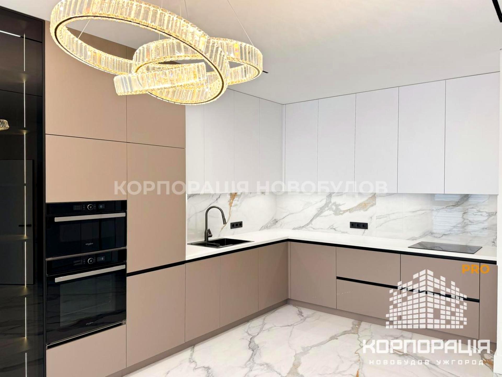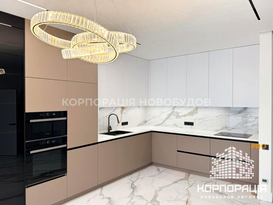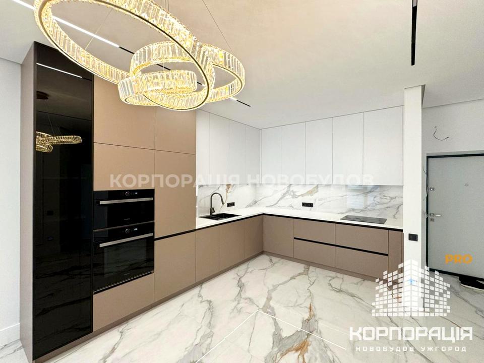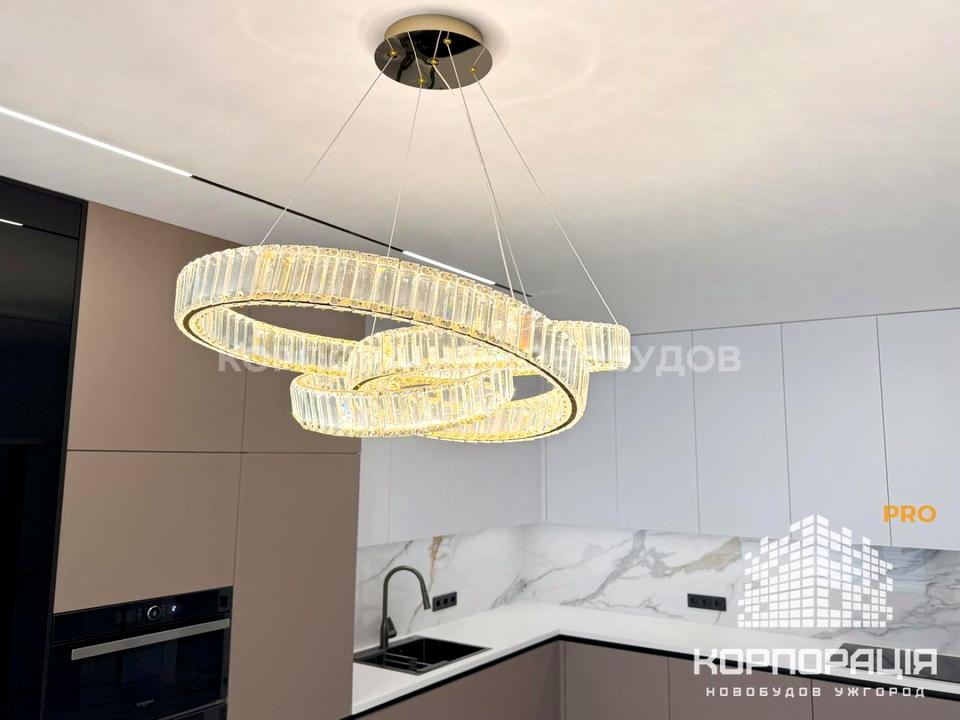 У квартирі дизайнерський ремонт, міжкімнатні двері прихованого монтажу, керамограніт, декоративні панелі, трекові світильники, підствітка, стильні люстри, ролети день/ніч.