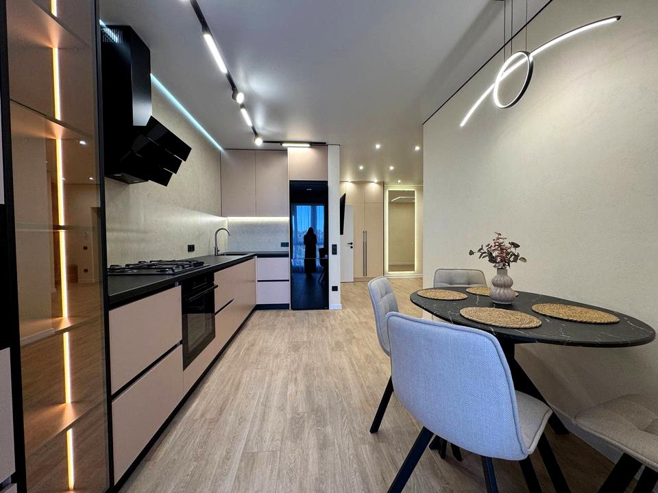 - простора кухня з всіми необхідними меблями та технікою (холодильник, пральна машина, витяжка, посудомийна машина, варильна поверхня, мікрохвильова піч, духова шафа, кондиціонер, бойлер на 50 л.) Обідній стіл і стільцями, красиві фасади кухні.