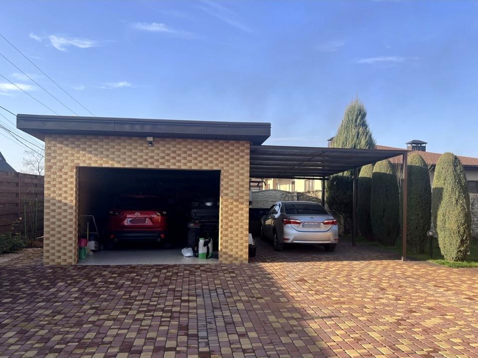 Капитальный гараж из ракушечника, обложенный плиткой внутри и снаружи, 28 квадратных метров. Навес из поликарбоната. Парковка на шесть машин.