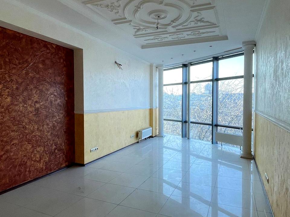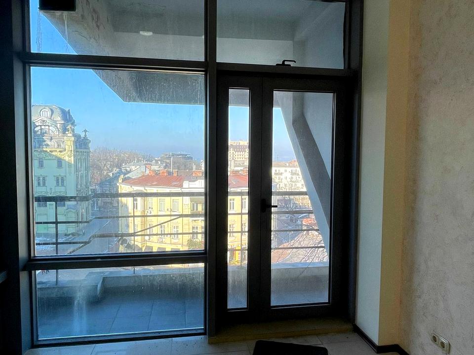 Фасадна частина з виходом на балкон та панорамним склінням, з якого відкривається прямий вид на Грецьку площу та Дерибасівську — статусно, презентабельно, впізнавано.