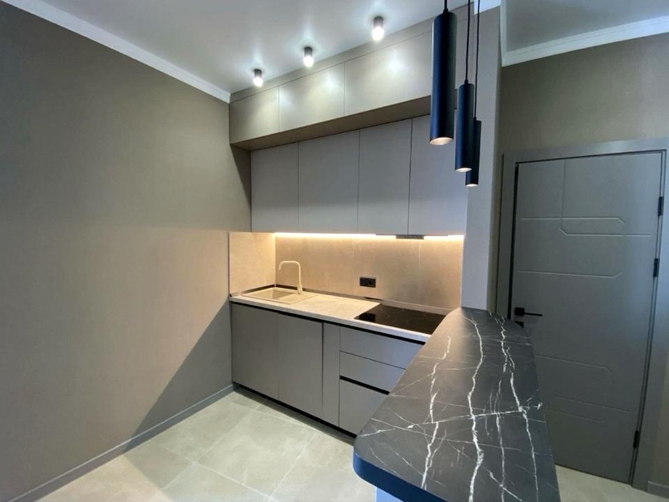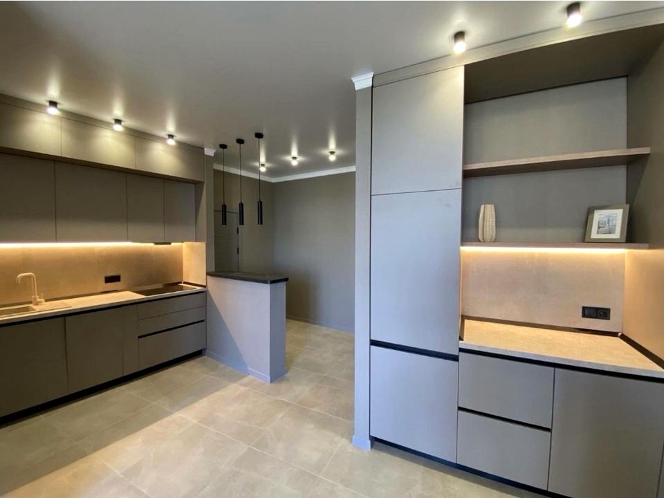 Большая кухня-студия + отдельная спальня с большой двуспальной кроватью. Оборудована большой гардеробной и вместительным шкафом в спальне.