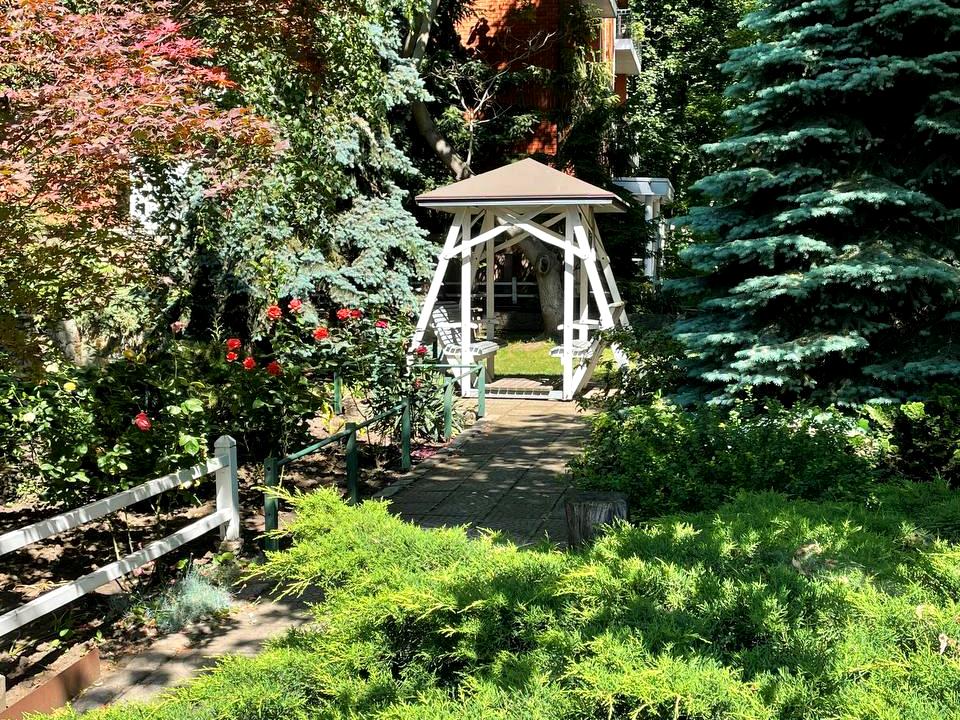Комплекс расположен на большой территории- 2,4 га. Территория утопает в зелени, красивый ландшафтный дизайн, беседки для отдыха, барбекю для жителей комплекса, детские площадки, есть свой мини-зоопарк с павлинами, два пруда с декоративными карпами, на территории живут белки, а пение птиц и свежий морской бриз - радует круглый год. Вы практически живете в парке Шевченко!