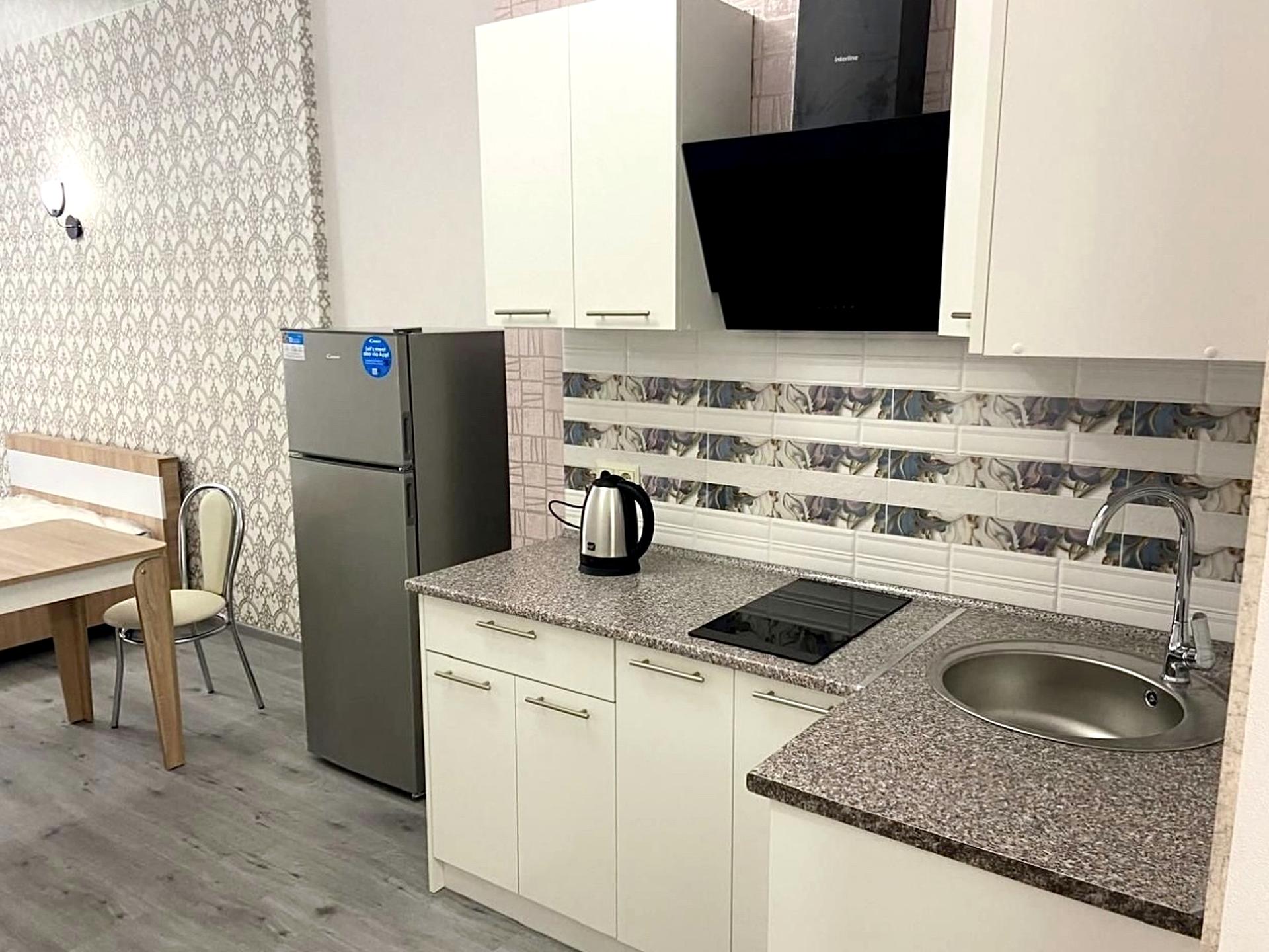 В квартире 1 комната, высота потолков 3 метра, Технологія будівництва - Монолітно-каркасна, Тип будинку - Спец. проект. Газа нет, кухонная плита электрическая. Есть балкон. В квартире есть Телевизор, Утюг, Подогрев полов, Кондиционер, Стиральная машина, Душевая кабина, Холодильник. Дом построен в 2022 году. Общее состояние квартиры - С ремонтом. Безбарьерность: пандус, вход в дом на уровне земли, дверные проемы в доме шириной более 0.9 м, парковочные места для людей з инвалидностью, лифт, приспособленный к инвалидной коляске. Горячая вода - электрический бойлер. Количество санузлов: 1. Интернет оптоволоконный. Работает без света - вода, отопление, интернет, лифт. Тип кухни - кухня-студия. Количество спален: 1. Комиссия за услуги 50 %