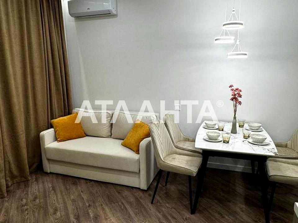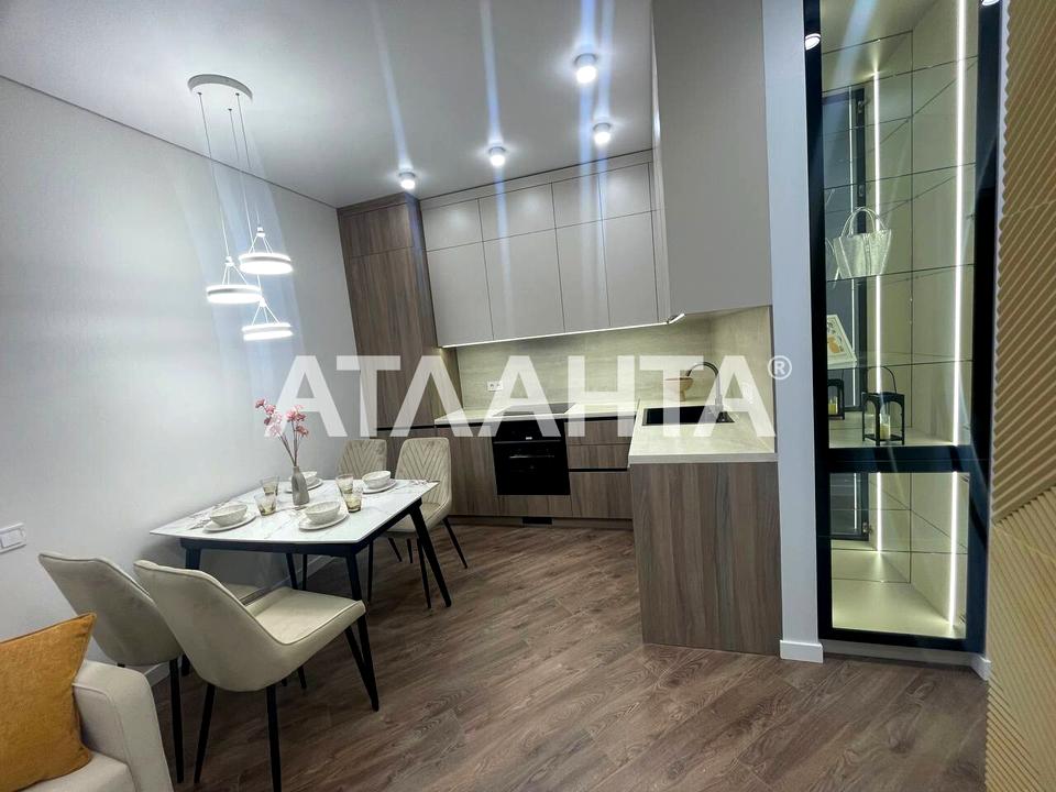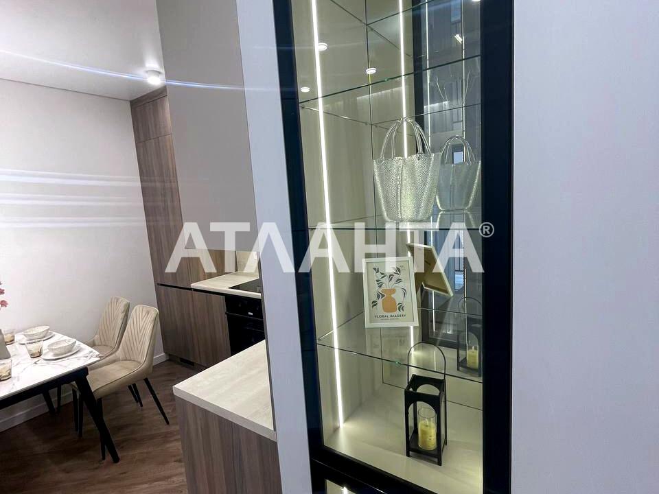 Площа квартири 41 квадратний метр розділена на окрему спальню, затишну кухню-студію, простору вбиральню та затишний балкон, звідки відкривається вид на мальовничий двір. Інтер'єр виконаний у дорогому дизайнерському стилі, меблі та техніка преміум-класу роблять це житло по-справжньому унікальним.