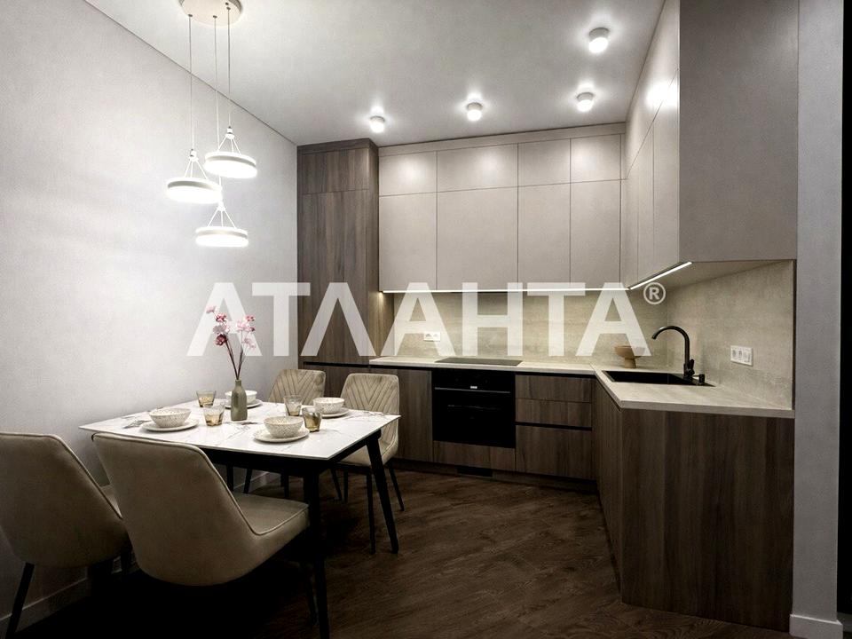 Площа квартири 41 квадратний метр розділена на окрему спальню, затишну кухню-студію, простору вбиральню та затишний балкон, звідки відкривається вид на мальовничий двір. Інтер'єр виконаний у дорогому дизайнерському стилі, меблі та техніка преміум-класу роблять це житло по-справжньому унікальним.