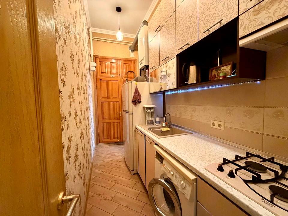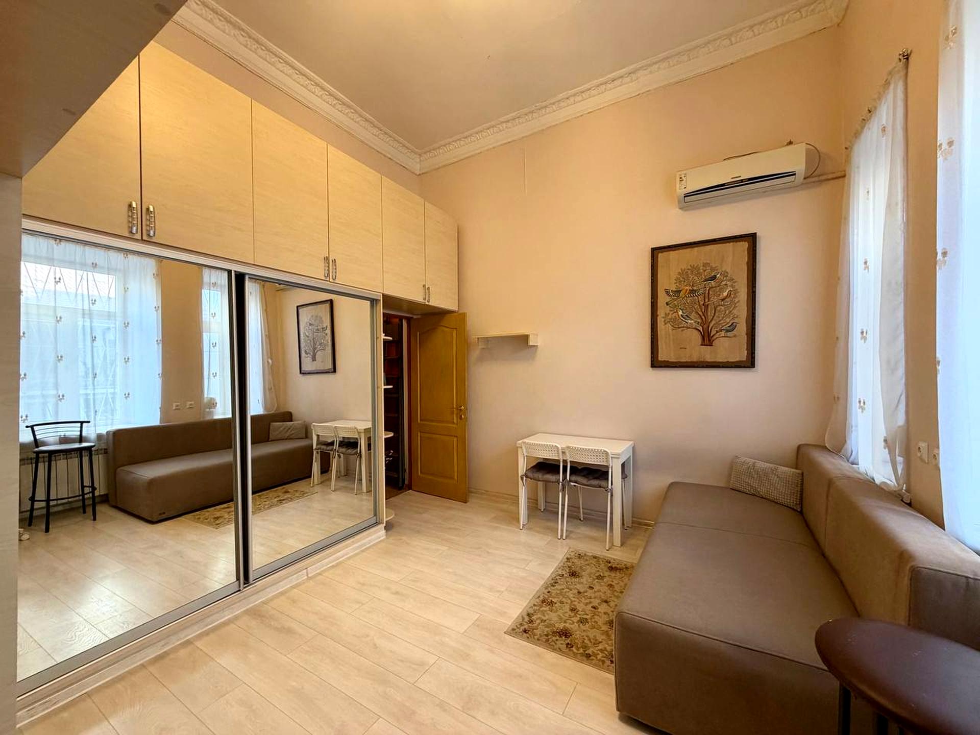 В квартире 1 комната, высота потолков 3.9 метра. Есть газ, кухонная плита газовая. Балкона нет. В квартире есть Кондиционер, Стиральная машина, Душевая кабина, Холодильник. Общее состояние квартиры - С ремонтом. Горячая вода - газовый котел. Количество санузлов: 1. Интернет оптоволоконный. Работает без света - вода, газ, отопление, интернет. Тип кухни - отдельная кухня. Количество спален: 1. Комиссия за услуги 2000 $