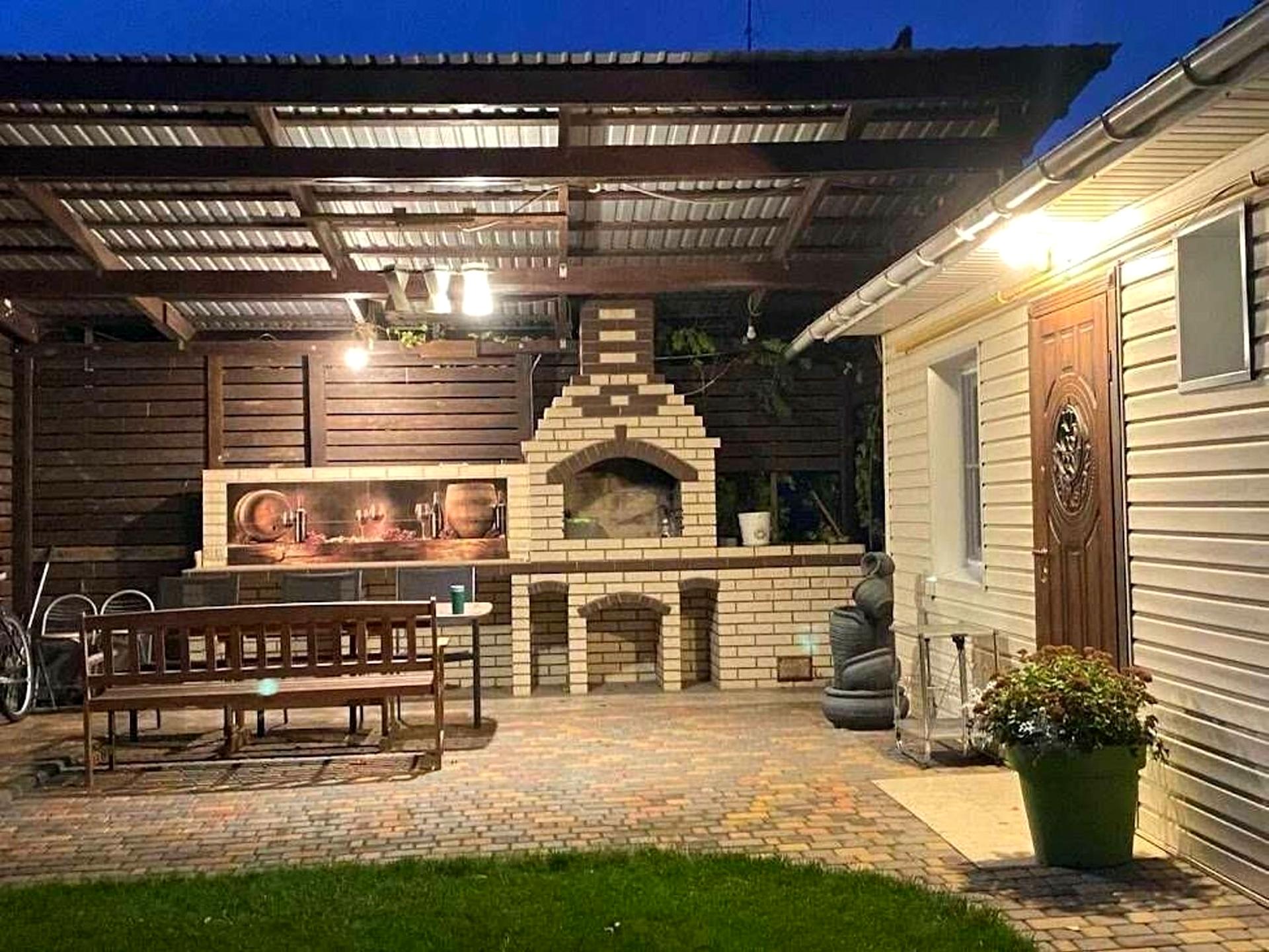 Спальня 19 м2 и детская или кабинет 6 м2, кухня-столовая 17,5 м2 с выхотом на большую терассу 26 м2 на которой расположена зона отдыха с барбекю, холодильник.