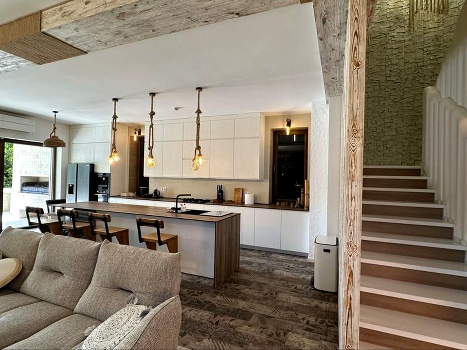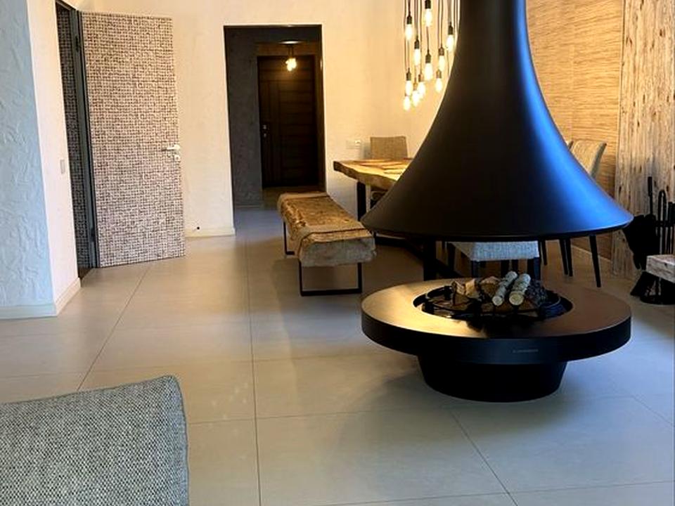 Ремонт выполнен в современном экостиле: натуральное дерево, камень, светлые тона. Атмосферу уюта создаёт уникальный «парящий» навесной камин.