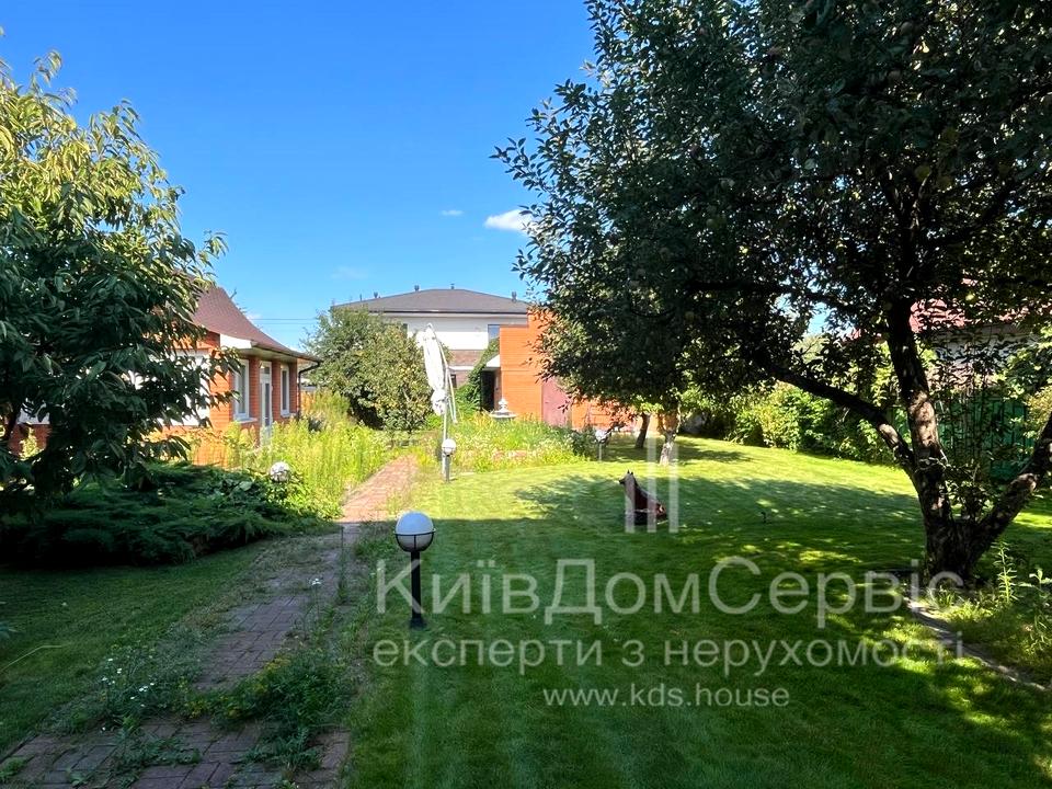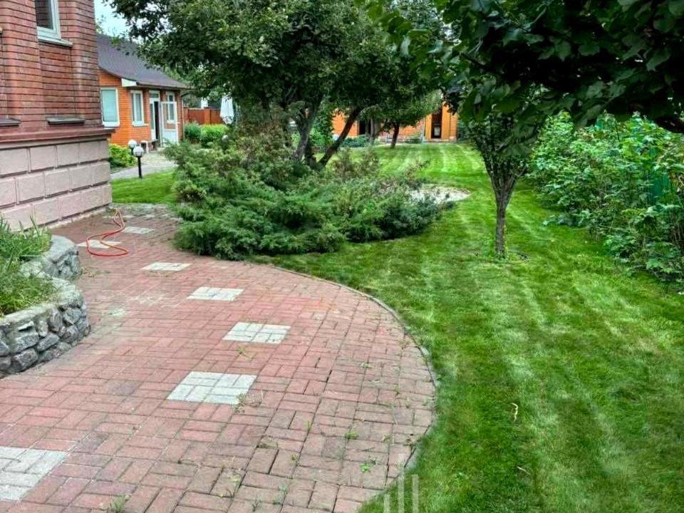 Велика ділянка (10 соток) з охайним газоном, квітником, фруктовими деревами, зоною для відпочинку та зоною барбекю.