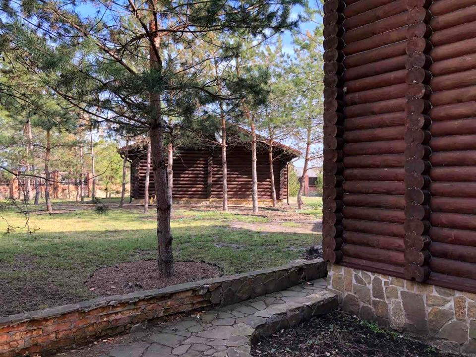 По всему участку ланшафтный дизайн . Вокруг сосновый лес.