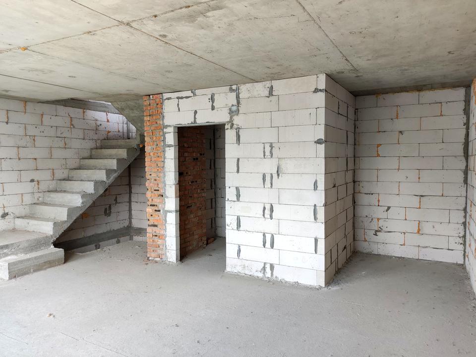 Таунхаус побудований в Британському стилі. Стіни газоблок з зовнішнім утепленням (пінопласт), перекриття залізобетон, вільне планування. Вже стоять бетоні сходи між поверхами. Дах - металочерепиця з утепленням. Комунікації: централізована вода та каналізація.