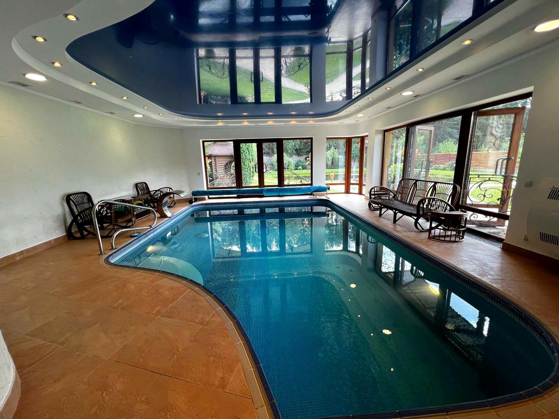 Є охоронець(оплачує господар), дизель-генератор, бесідка, 3 мангали, критий басейн, озеро, баня, більярдна, спортзал, гостьова кімната, ну і господарський дім на 2-3 спальні, 2 с/у, кухня, кабінет, яблуневий сад, парник для рослин, гараж, критий навіс для 2-3 машин.