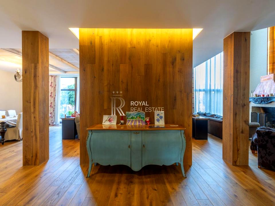Перший поверх вражає просторою кухнею, їдальнею та гостьовою з каміном, а також має пральню, технічну кімнату, критий басейн. Другий поверх включає чотири спальні