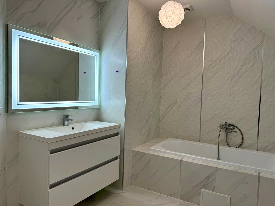 Загальна площа 220м2 (3 окремі кімнати, гардеробна кімната, 2 вітальні зони, одна з яких з діючим каміном, кухня-столова, 2 ванні кімнати та котельня з входом у підвал, гараж)