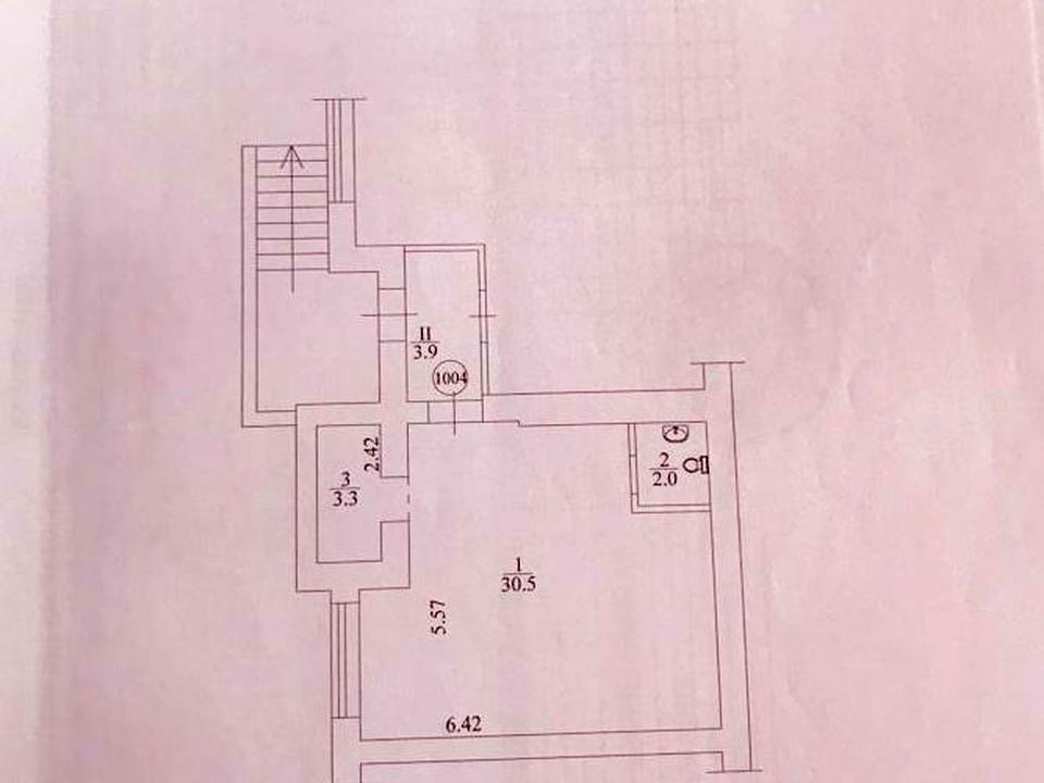 Площа основного приміщення 30,5м2, с/в 2,0м2, тамбур 3,9м2, підсобне приміщення 3,3м2.