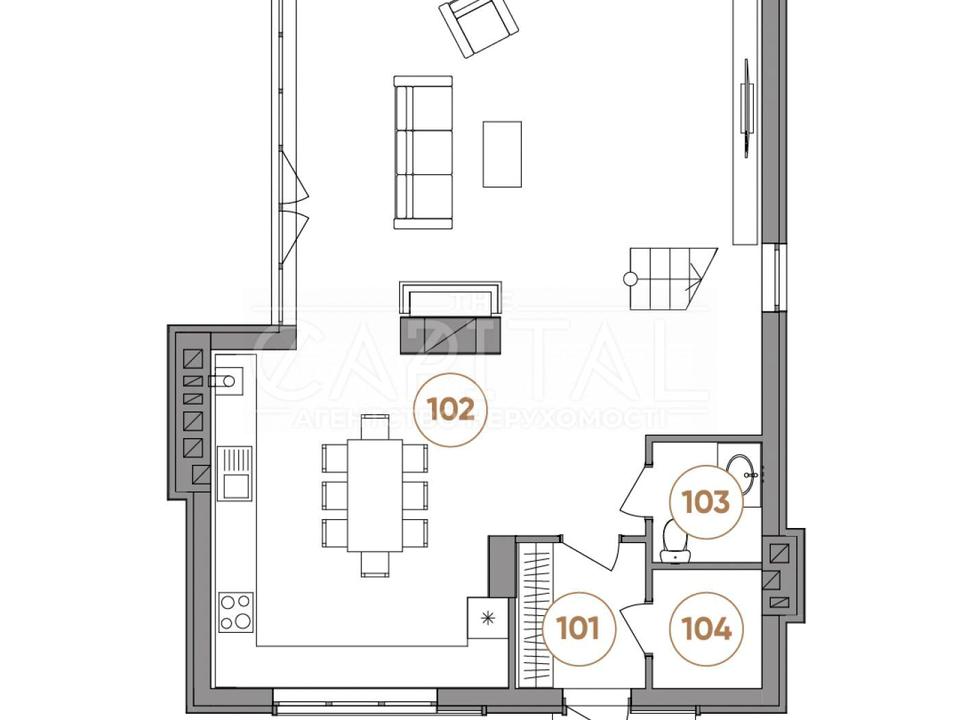 Простора кухня-їдальня — 63.9 м²: відкритий простір із місцем для великого столу, кухонного острова та лаунж-зони