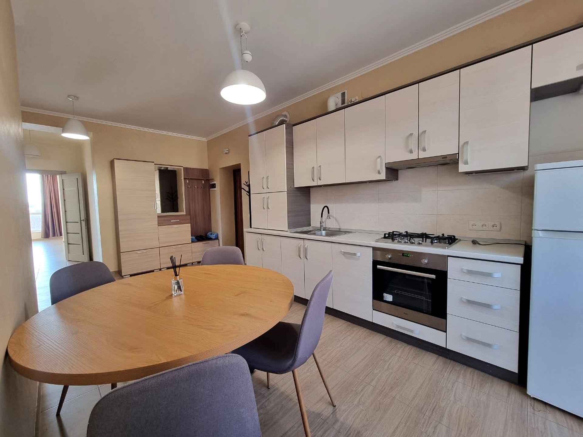 В квартире 2 комнаты, высота потолков 2.7 метра, Технологія будівництва - Монолітно-каркасна, Тип будинку - Спец. проект. Есть газ, кухонная плита газовая. Есть балкон. В квартире есть Кондиционер, Стиральная машина, Ванна, Холодильник, Посудомойная машина. Дом построен в 2017 году. Общее состояние квартиры - С ремонтом. Горячая вода - газовый котел. Количество санузлов: 2. Интернет оптоволоконный. Работает без света - вода, газ, интернет. Тип кухни - кухня-студия. Количество спален: 2. Комиссия за услуги 100 %