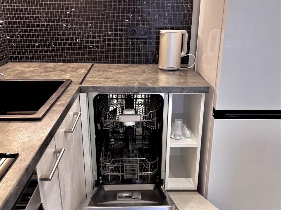 посудомийна машина, духовка, варильна панель, мікрохвильова піч, холодильник, пральна машина, електрочайник, праска, фен, пилосос, телевізор, швидкісний інтернет та Wi-Fi.