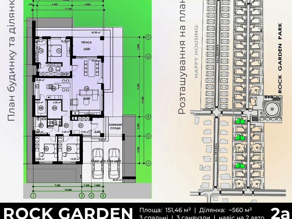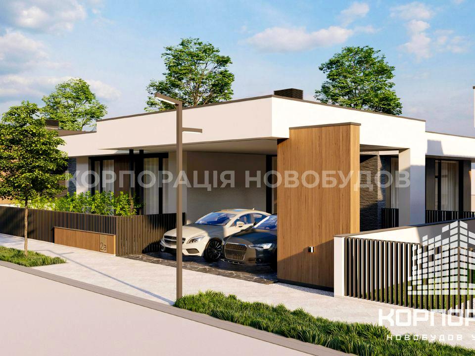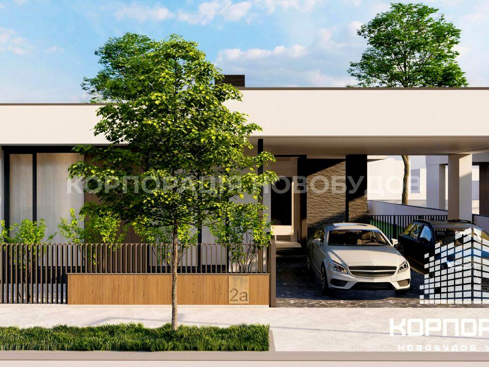 Планування: кухня-вітальня з коморою (64 м²), 3 спальні, одна з них мастер-спальня зі своїм санвузлом та гардеробною, + ще два санвузли, гардеробна, технічне приміщення, тераса (42.50 м²), навіс для 2-х авто (45 м²).