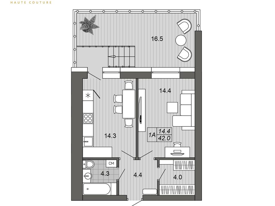 42 / 14.4 / 14.3 м²