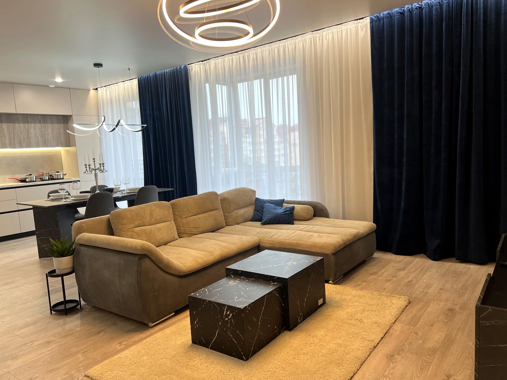 В квартире 3 комнаты, Тип будинку - Спец. проект. Есть газ. В квартире есть Телевизор, Кабельное ТВ, Утюг, Подогрев полов, Кондиционер, Стиральная машина, Сушильная машина, Душевая кабина, Ванна, Джакузи, Холодильник. Дом построен в 2022 году. Общее состояние квартиры - С ремонтом. Горячая вода - газовый котел. Количество санузлов: 2. Тип кухни - кухня-студия. Количество спален: 2. Комиссия за услуги 50 %